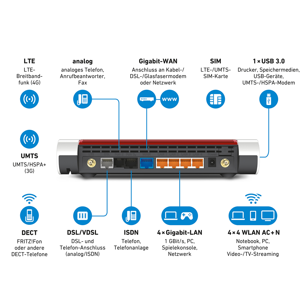 Die FRITZ!Box 6890 LTE funkt in fünf LTE- sowie zwei UMTS-Frequenzen und unterstützt Roaming für das Surfen in allen Mobilfunknetzen. Sowohl über LTE als auch über DSL können Geschwindigkeiten von bis zu 300 MBit/s erzielt werden. Zusätzlich kann sie an jedem DSL-Anschluss eingesetzt werden. Die FRITZ!Box unterstützt mit VDSL-Supervectoring schon jetzt den künftigen Standard für Übertragungsleistungen von bis zu 300 MBit/s. Damit verdreifacht sich die Geschwindigkeit am DSL-Anschluss und Downloads riesiger Datenpakete erfolgen in Rekordgeschwindigkeit. Die FRITZ!Box 6890 LTE kann sowohl an IP- wie auch an herkömmlichen DSL-Anschlüssen (wahlweise auch mit analoger oder ISDN-Telefonie) sämtlicher Anbieter eingesetzt werden.