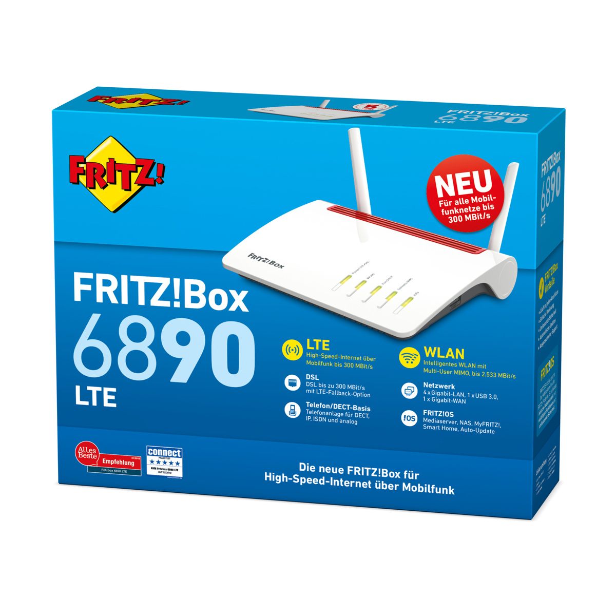 Die FRITZ!Box 6890 LTE von AVM ist der erste Router, der sich sowohl an DSL-Anschlüssen als auch in Mobilfunknetzen einsetzen lässt. Für die Verbindung zum Internet stehen wahlweise ein integriertes 4G-/3G-Modem oder ein VDSL-Modem inkl. Supervectoring 35b für Internetgeschwindigkeiten von bis zu 300 MBit/s zur Verfügung. Modernstes High-End-WLAN AC+N sorgt für noch mehr Reichweite und deutlich höhere Geschwindigkeiten von bis zu 2.533 MBit/s.