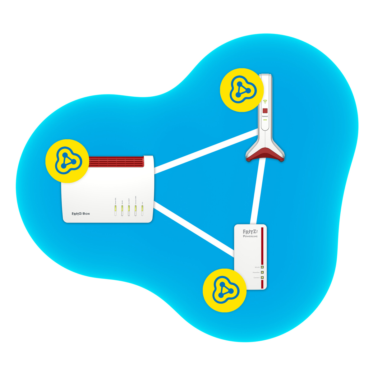 Damit Videos, Musik und Fotos im Heimnetz nahtlos bis in den letzten Winkel jedes Zimmers gelangen, setzt der FRITZ!Repeater 6000 auf WLAN Mesh. Die verteilten FRITZ!-Geräte arbeiten in einem einzigen Netz, tauschen sich untereinander aus und optimieren die Leistung aller WLAN-Geräte.