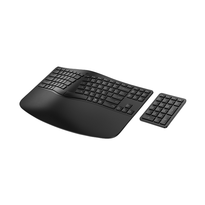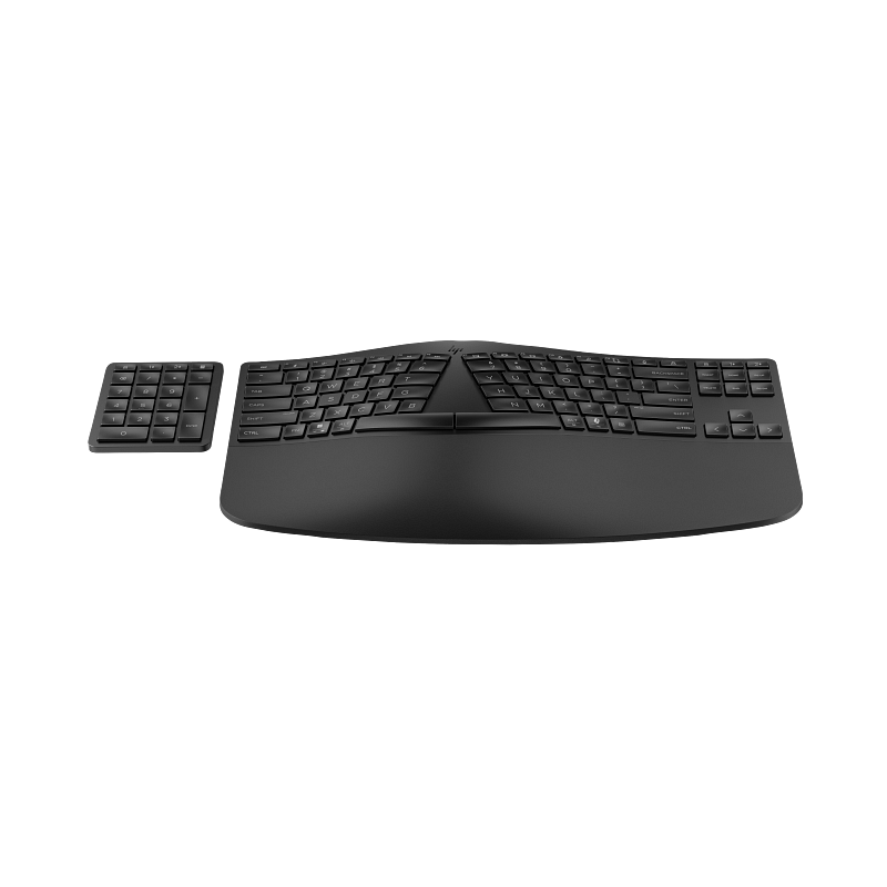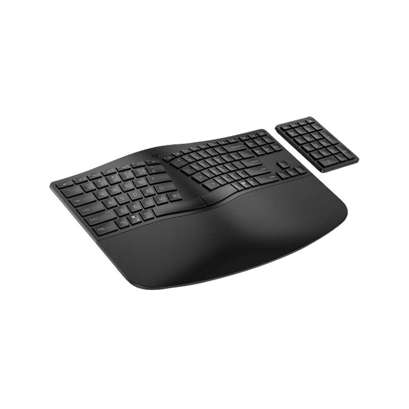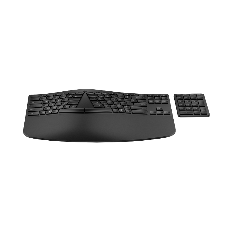 Optimieren Sie Ihren Arbeitsbereich dank der ergonomischen Wireless-Tastatur von HP mit einem geteilten Design, anpassbaren Ziffernblöcken 1 und der komfortablen Möglichkeit, mehrere Geräte anzuschließen.