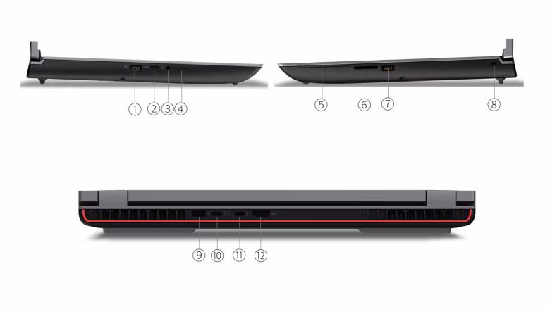 1. USB-A (USB 5Gbps), Always On 2. USB-C® (USB 10Gbps), data transfer only 3. Headphone / microphone combo jack (3.5mm) 4. Nano-SIM card slot* 5. Smart card reader* 6. SD Express 7.0 card reader | 7. USB-A (USB 5Gbps) 8. Kensington® Nano Security Slot™ 9. Power connector 10. Thunderbolt™ 4 11. Thunderbolt™ 4 12. HDMI® |