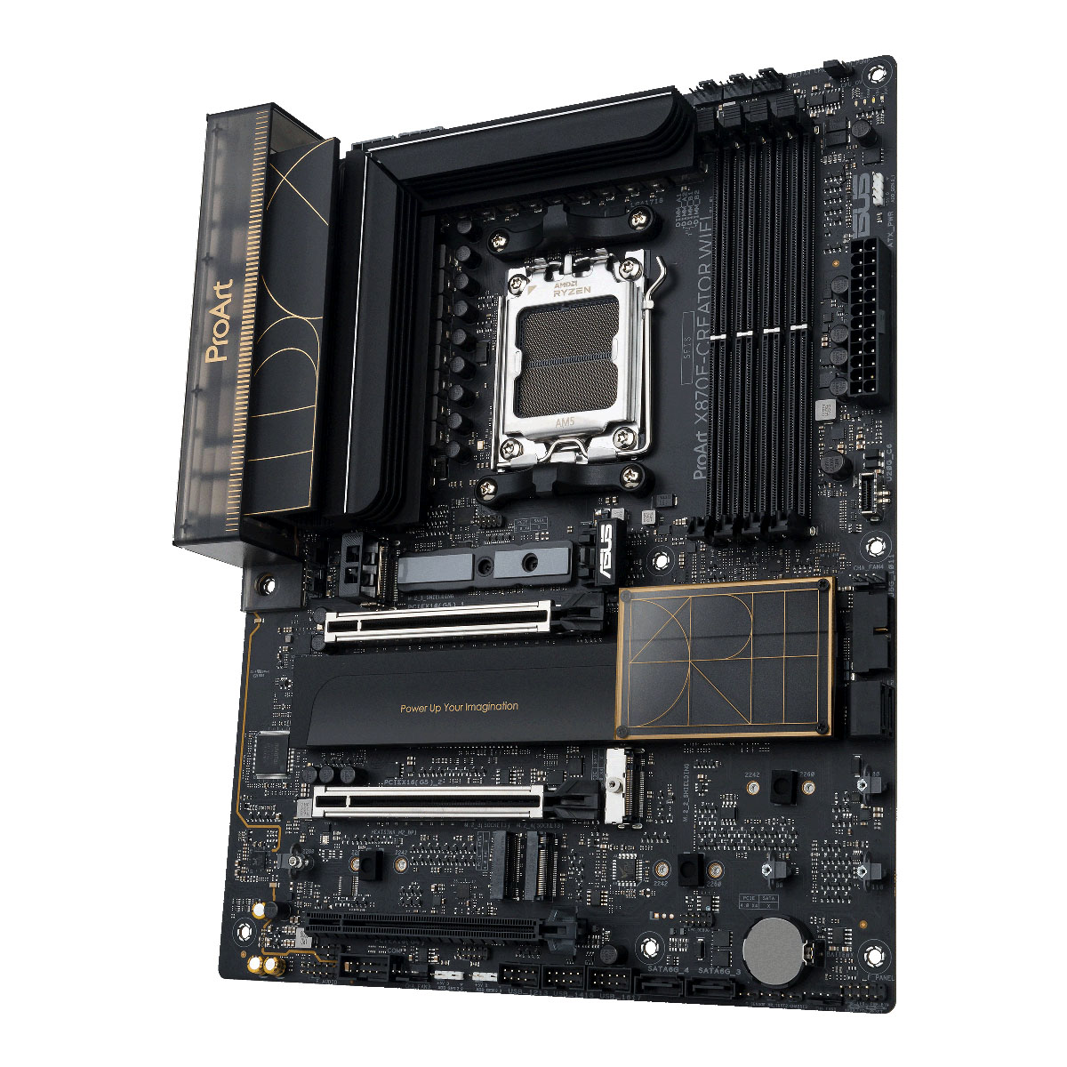 Das ProArt X870E-Creator WiFi unterstützt Kreative aller Niveaus, indem es die Leistung der neuesten AMD Ryzen™ Prozessoren der Serien 9000, 8000 und 7000 mit 16+2+2 Team-Power Stages, DDR5-Steckplätzen, PCIe® 5.0 und blitzschneller Konnektivität einschließlich Dual-USB4®, 10G- und 2.5G-Ethernet und WiFi 7 maximiert. Dieses Mainboard verkörpert eine professionelle, elegante und klare Vision für Content Creator aller Art, deren Stil durch farblich abgestimmte schwarze Oberflächen mit metallischen Goldakzenten unterstrichen wird. Eine durchsichtige Abdeckung gewährt einen eleganten Blick auf die hochwertigen Anschlüsse im Inneren. |