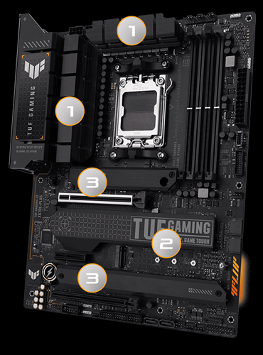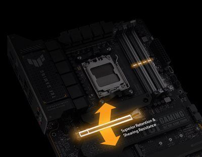 | DRAM Overclocking Performance Umfassende Speichertuning-Optionen sind der Eckpfeiler der TUF GAMING Mainboards. Mit dem TUF GAMING X670E-PLUS WIFI kannst du das gesamte Potenzial deiner DDR5-Module ausschöpfen, egal ob es sich um ein extrem schnelles Kit oder ein Einsteigerset handelt, das sonst gesperrt wäre. | PCIe 5.0 Unterstützung Das TUF GAMING X670E-PLUS WIFI verfügt außerdem über einen PCIe 5.0 M.2-Steckplatz für die schnellsten Datenübertragungen von bis zu 128 Gbit/s* und alle M.2-Steckplätze unterstützen NVMe- und SATA-RAID-Konfigurationen, damit du die neuesten verfügbaren Geschwindigkeiten nutzen kannst. |