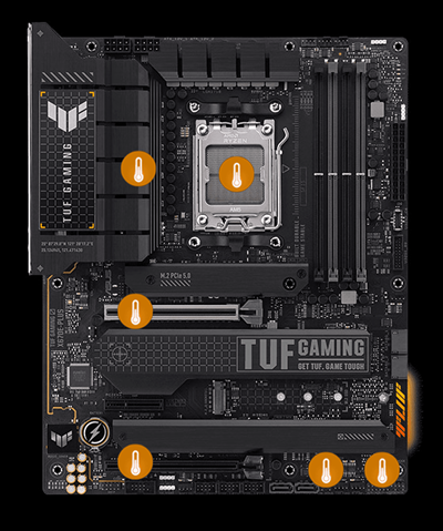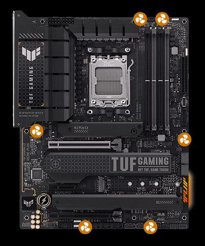 TUF-Kondensatoren Die schwarzen TUF 5K-Metallkondensatoren bieten eine 52 % größere Temperaturtoleranz und eine 2,5 Mal längere Lebensdauer als Standard-Mainboard-Kondensatoren.