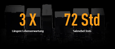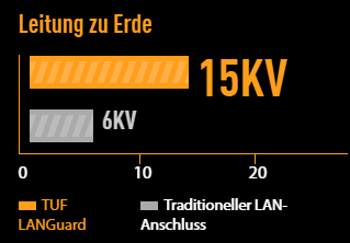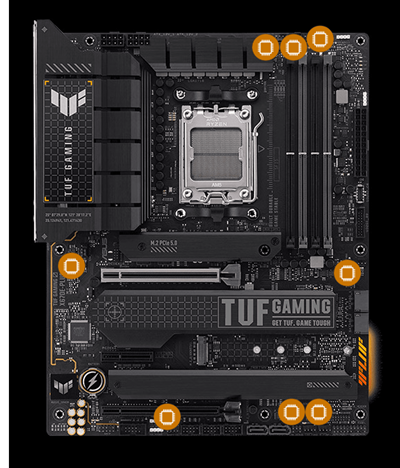 | SafeSlot & SafeDIMM PCIe 5.0 ist 2x schneller als PCIe 4.0. Deshalb haben wir unseren SMT-Fertigungsprozess für den schnelleren SafeSlot angepasst, um die höchsten Datengeschwindigkeiten zu gewährleisten. SafeSlot ist eine verstärkte Metallumhüllung, die einem PCIe-Steckplatz hinzugefügt wird, um eine Karte sicher zu befestigen. Die robusten ASUS SafeDIMM-Ummantelung unterstützen und schützen Speichermodule auf ausgewählten ASUS-Mainboards und ermöglichen es dir, deine Module schnell, präzise und sicher einzusetzen. | ESD-Schutzvorrichtungen ESD-Schutzvorrichtungen verlängern die Lebensdauer von Bauteilen und verhindern Schäden durch elektrostatische Entladungen. Sie bieten Schutz für Luftentladungen bis zu +/- 10 kV und Kontaktentladungen bis zu +/- 6 kV und übertreffen damit die entsprechenden Industriestandards von +/- 6 kV und +/- 4 kV. Oberflächenmontierte TVS-Dioden in einem dualen Inline-Gehäuse schützen deinen PC vor Spannungsspitzen. | TUF LANGuard TUF LANGuard ist eine Innovation nach Militärstandards, die eine fortschrittliche Signalkopplungstechnologie und hochwertige oberflächenmontierte Kondensatoren integriert, um den Durchsatz zu verbessern und das Mainboard vor Blitzeinschlägen und statischer Entladung zu schützen. | Rückseitiges Anschlusspanel aus Edelstahl TUF GAMING Mainboards haben eine korrosionsbeständige Blende aus Edelstahl für die rückseitigen Anschlüsse, das mit Chromoxid beschichtet ist und eine dreimal längere Lebensdauer als herkömmliche Blenden hat. Mit dieser Schutzfunktion haben die TUF GAMING Mainboards den 72-Stunden-Salznebeltest bestanden, während andere Marken nur einen 24-Stunden-Test bestanden haben. |