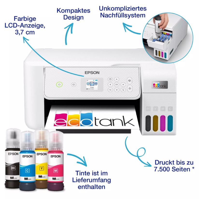 Endlich drucken ohne Patronen!EcoTank ermöglicht komfortables Drucken zu Hause. Die großvolumigen Tintentanks ermöglichen ein unkompliziertes Nachfüllen. Da die Tintenflaschen über ein Schlüssel-Schloss-Prinzip funktionieren, kann nur die jeweils richtige Tinte eingefüllt werden. | Weiter sparenMit diesem sparsamen Drucker reduzieren Sie Ihre Tintenkosten um bis zu 90 %*. Im Lieferumfang enthalten ist ein Tintenvorrat für bis zu 3 Jahre*. Ein Satz Tintenflaschen ermöglicht das Drucken von bis zu 4.500 Seiten in Schwarzweiß und 7.500 Seiten in Farbe. | Epson Smart Panel-AppMit dieser App können Sie Ihren Drucker über Ihr Smart-Gerät bedienen*. Sie können Dokumente und Fotos drucken, kopieren und scannen, Ihren Drucker einrichten und steuern, Fehler beheben und Ihrer Kreativität dank einer Vielzahl von Vorlagen freien Lauf lassen. |