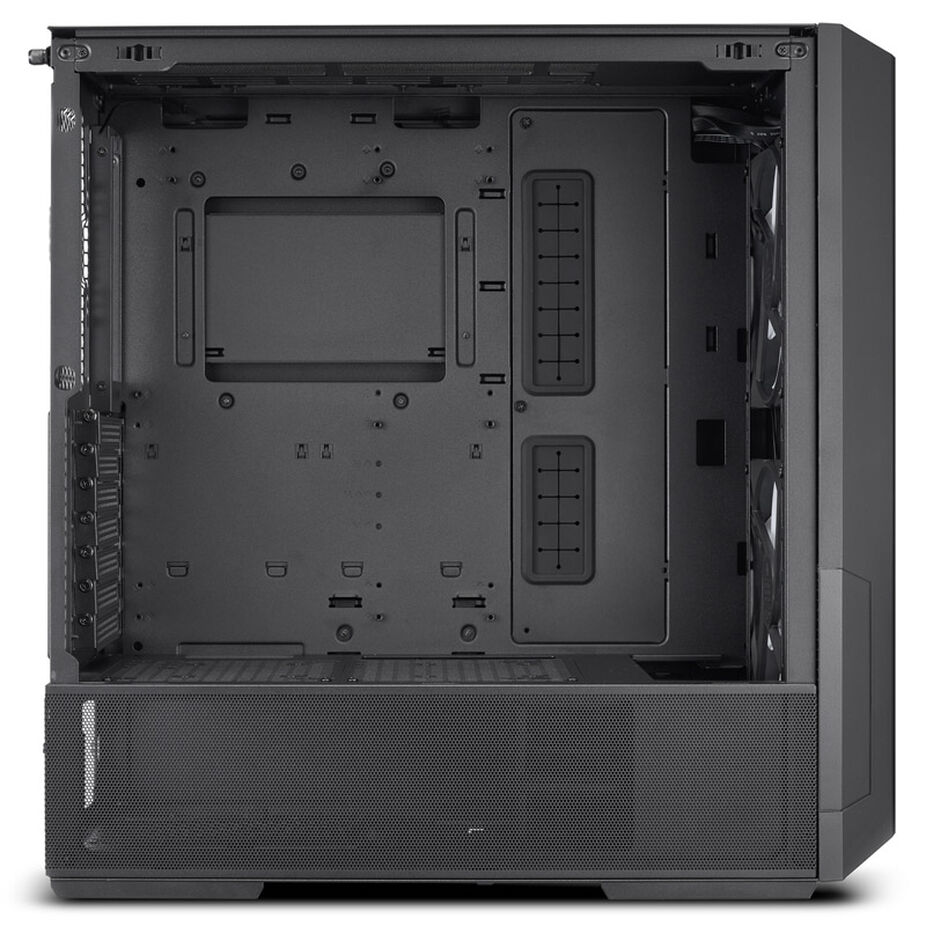 Der ganz in Schwarz gehaltene Innenraum des LANCOOL 216 bietet reichlich Platz für leistungsstarke Hardware, sodass E-ATX-Mainboards bis 280 mm Breite und performante Gaming-Grafikkarten mit bis zu 392 mm Länge eingebaut werden können. Die 7 Erweiterungsslots sind in einer modularen Halterung untergebracht und lassen sich um 90 Grad drehen, sodass die Grafikkarte (mithilfe eines separat erhältlichen Riser-Kabels) vertikal installiert werden kann.