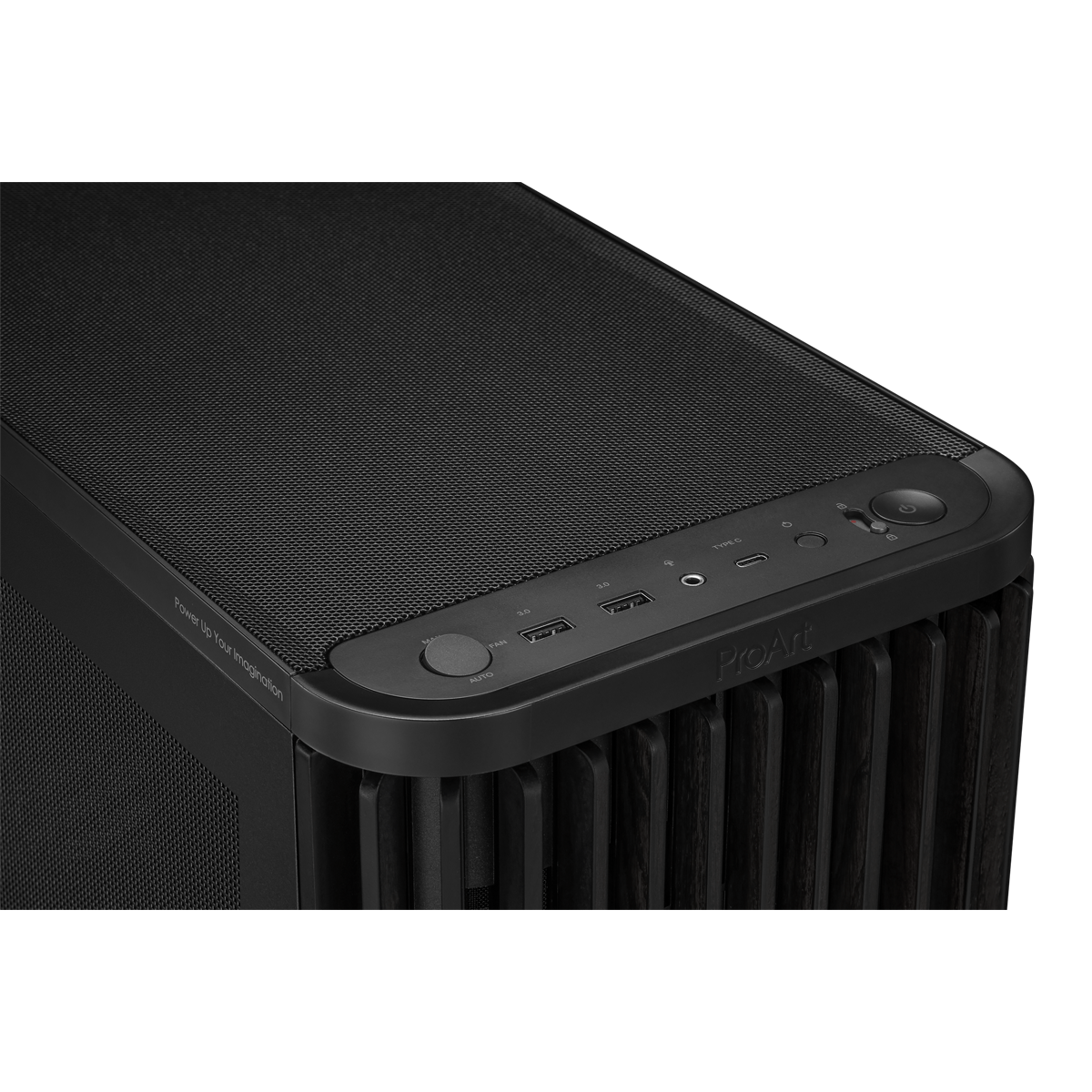 | ProArt PA401 Wood Edition ATX-Gehäuse mit Mesh-Panel, 240-mm-Radiatorhalterung, 160x32-mm-Lüfter, Verriegelung an der linken Seite des Gehäuses, Verriegelung der Power- und Reset-Tasten, abnehmbare Netzteilhalterung, rückseitige Kabelklemmen
