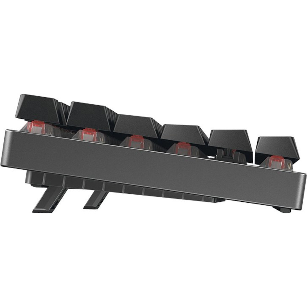 Die CHERRY MX 8.2 TKL Wireless verfügt über ein massives Aluminiumgehäuse, was sie trotz ihrer kompakten Abmessungen hochwertig und stabil macht. Da die kabellose mechanische Tastatur im TKL-Format nur wenig Platz benötigt, wirkt dein Schreibtisch gleich ordentlicher. Und auch aus ergonomischer Sicht ist der fehlende Nummernblock von Vorteil: Dein Mausarm liegt dadurch näher an der Tastatur, wodurch du automatisch eine optimierte Schulterhaltung einnimmst und so weniger mit Verspannungen zu kämpfen hast. Die Höhe lässt sich mit den Ausklappfüßen verstellen.
