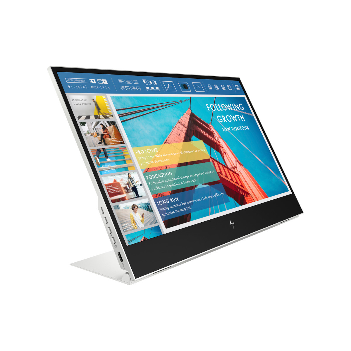Doppelte Produktivität mit dem tragbaren HP E14 G4 Monitor. Nehmen Sie ihn aus seiner weichen Hülle, stellen Sie ihn mit seiner Stütze auf und schließen Sie ihn ganz einfach mit nur einem USB-C™-Kabel an. Genießen Sie auf dem superhellen Bildschirm drinnen wie draußen ein gestochen scharfes Bild.