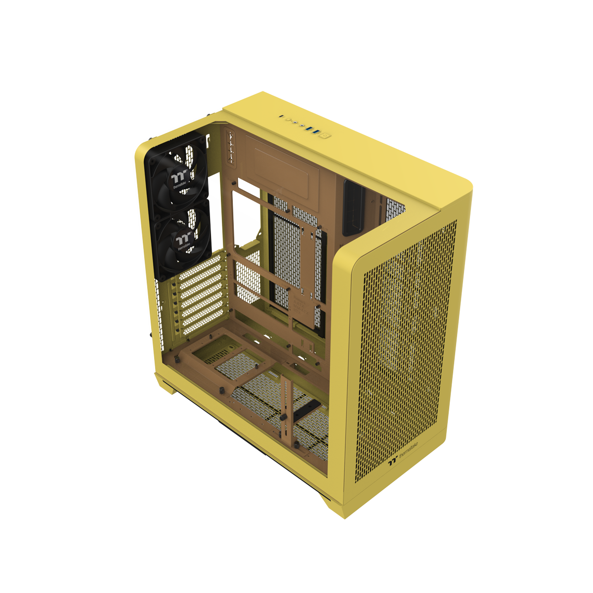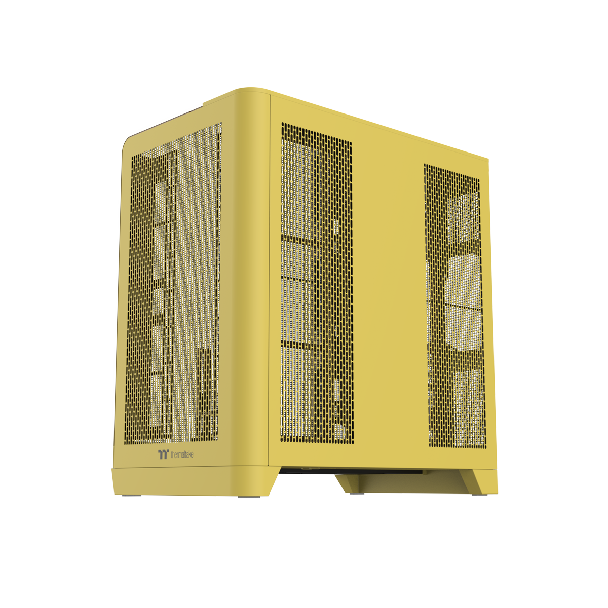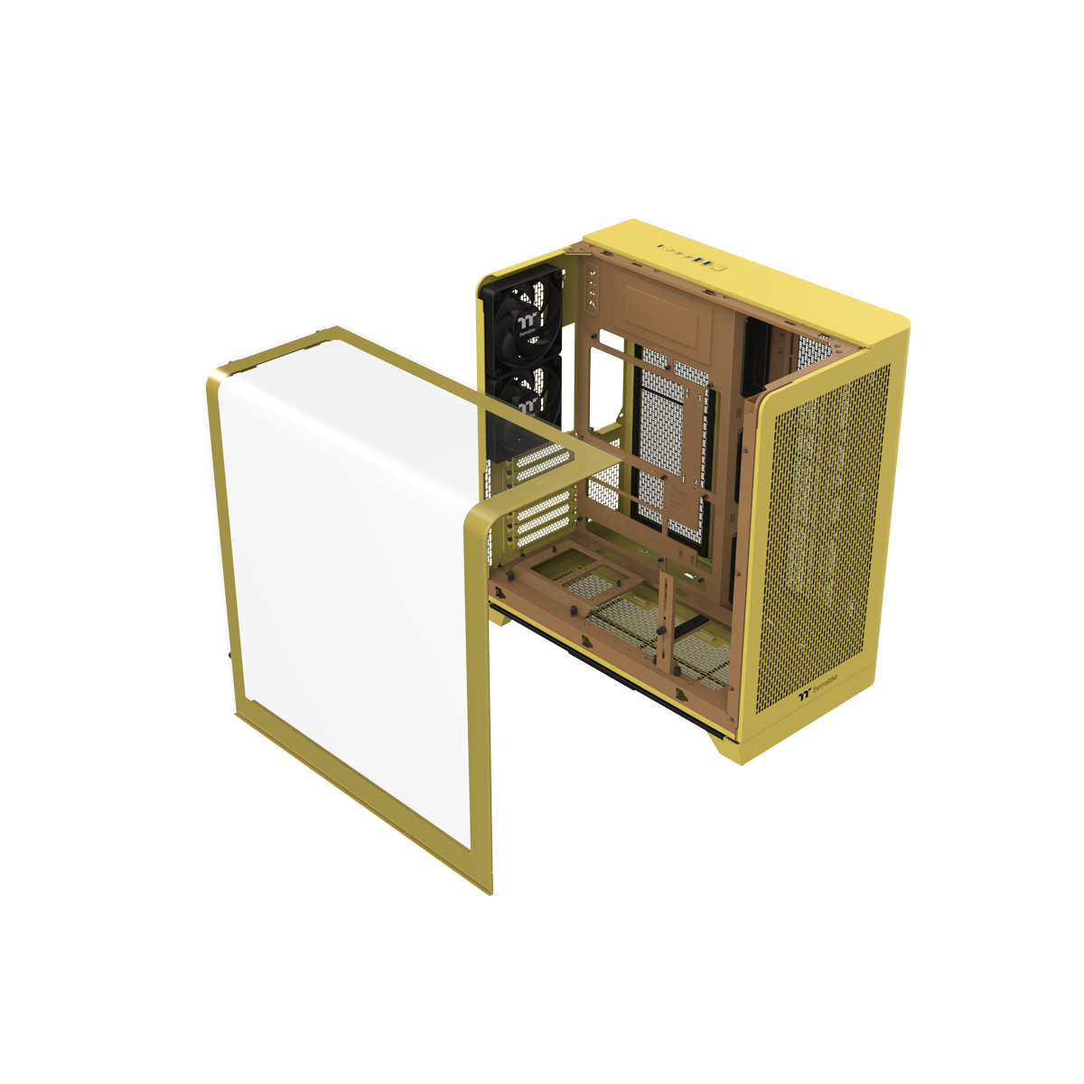 Das obere I/O-Panel stellt zwei USB 3.0-Ports, einen USB 3.2 Gen 2 Typ-C, HD-Audio, eine Reset-Taste sowie einen beleuchteten Power-Button bereit. Zusätzlich lässt sich das Gehäuse mit dem optionalen LCD Screen Kit (3,9? oder 6?) erweitern, das via TT RGB Plus Software zur Anzeige von Systemwerten oder Animationen genutzt werden kann.