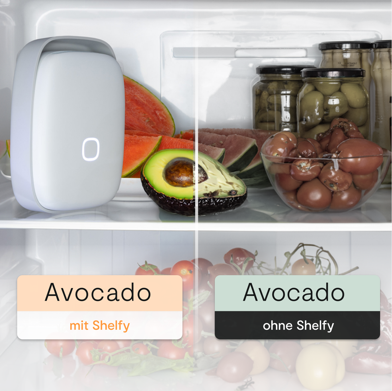 Entfernt 80 Prozent aller Gerüche Die photokatalytische Technologie von Shelfy verlängert die Frische von Lebensmitteln, indem sie dasAuftreten von Schimmel und unangenehmen Gerüchen verzögert. | |