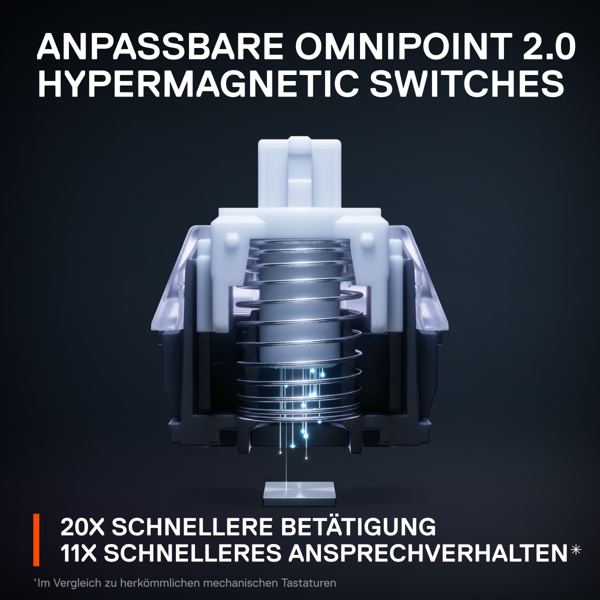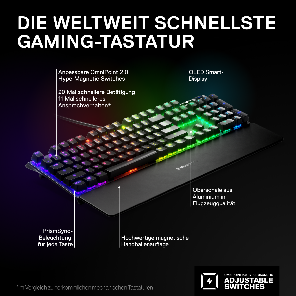 Apex Pro Die schnellste Tastatur aller Zeiten – lass deine Gegner im Staub stehen. Unsere Switches liefern ein 11x schnelleres Ansprechverhalten und eine 10x schnellere Betätigung.Die hochmodernen Magnetsensoren sorgen für geringstmögliche Reaktionszeiten.