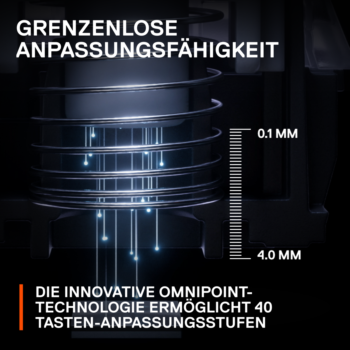 OmniPoint 2.0-Switches Gestalte die Tastatur nach deinen Wünschen, indem Sie den Registrierungsabstand jeder Taste auf 0,1 mm genau einstellst. Stelle die Tasten auf einen federleichten Anschlag mit 0,2 mm ein oder entscheide dich für einen tiefen Druck mit 3,8 mm für einen entscheidenden Tastendruck.