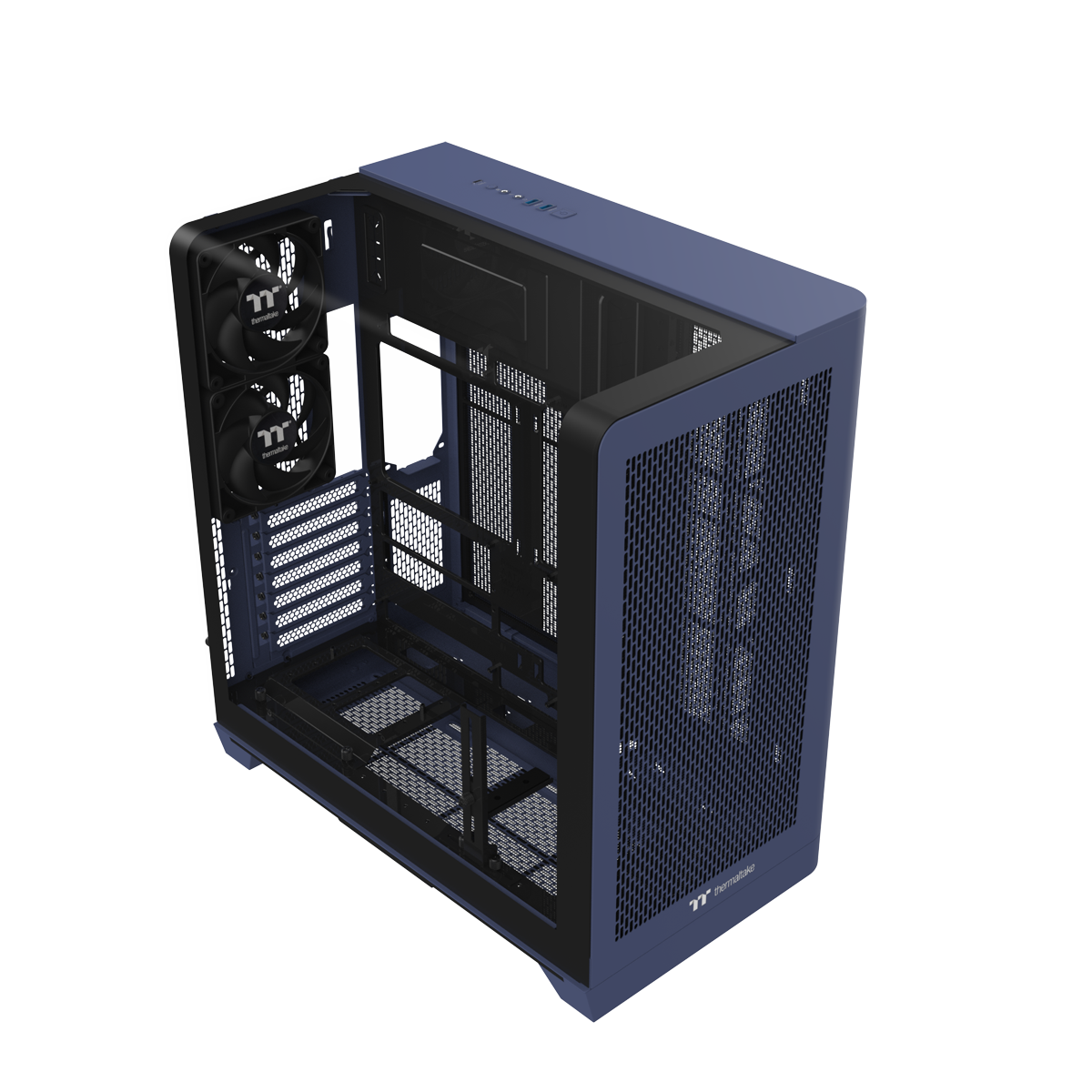 Das obere I/O-Panel stellt zwei USB 3.0-Ports, einen USB 3.2 Gen 2 Typ-C, HD-Audio, eine Reset-Taste sowie einen beleuchteten Power-Button bereit. Zusätzlich lässt sich das Gehäuse mit dem optionalen LCD Screen Kit (3,9? oder 6?) erweitern, das via TT RGB Plus Software zur Anzeige von Systemwerten oder Animationen genutzt werden kann.